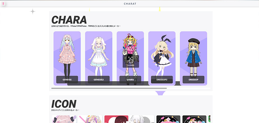 CHARATは、さまざまな着せ替えメーカーを集約した総合キャラメイクサイトです。立ち絵専用ツール「CHARAT GENESIS」をはじめ、ミニキャラ・SDキャラ・VTuber風など、多彩なスタイルが揃っています。パーツを選択していくだけで自分好みの立ち絵を完成させることができ、データは透過PNGで出力可能です。