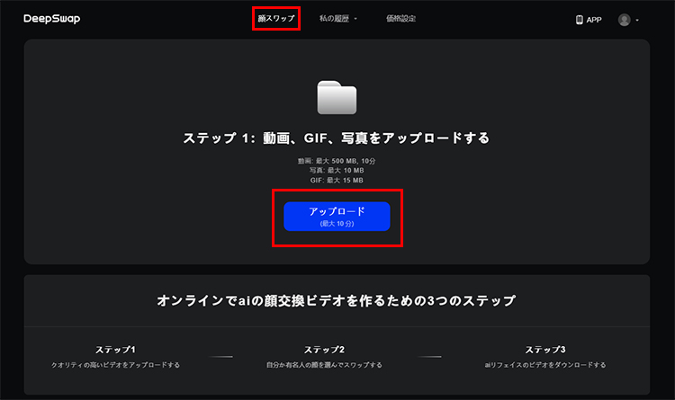 まずはDeepSwap公式サイトにアクセスして、登録します。上に「顔スワップ」をクリックして、ご覧のように見えます。