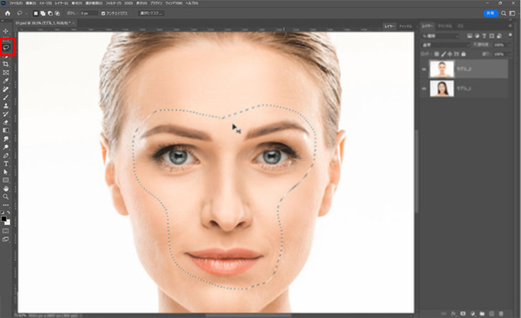 レイヤーリストで、「Ctrl」を押しながらレイヤーマスクやレイヤーのサムネイルをクリックして、顔の範囲を選択します。