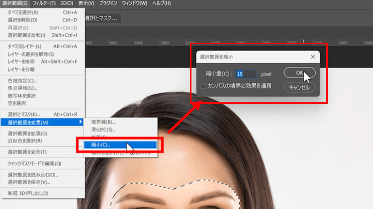 メニューから「選択範囲」をクリックして、「選択範囲を変更」に「縮小」をクリックします。新たなウィンドウで縮小量を入力して「OK」ボタンをクリックします。